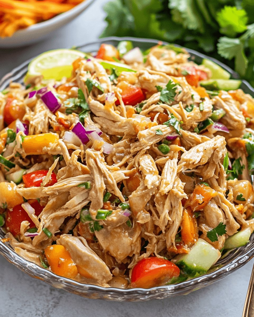 In a large bowl, combine the mixed salad greens, shredded chicken, carrots, red bell pepper, cucumber, red onion, and cilantro. Toss gently to mix.
