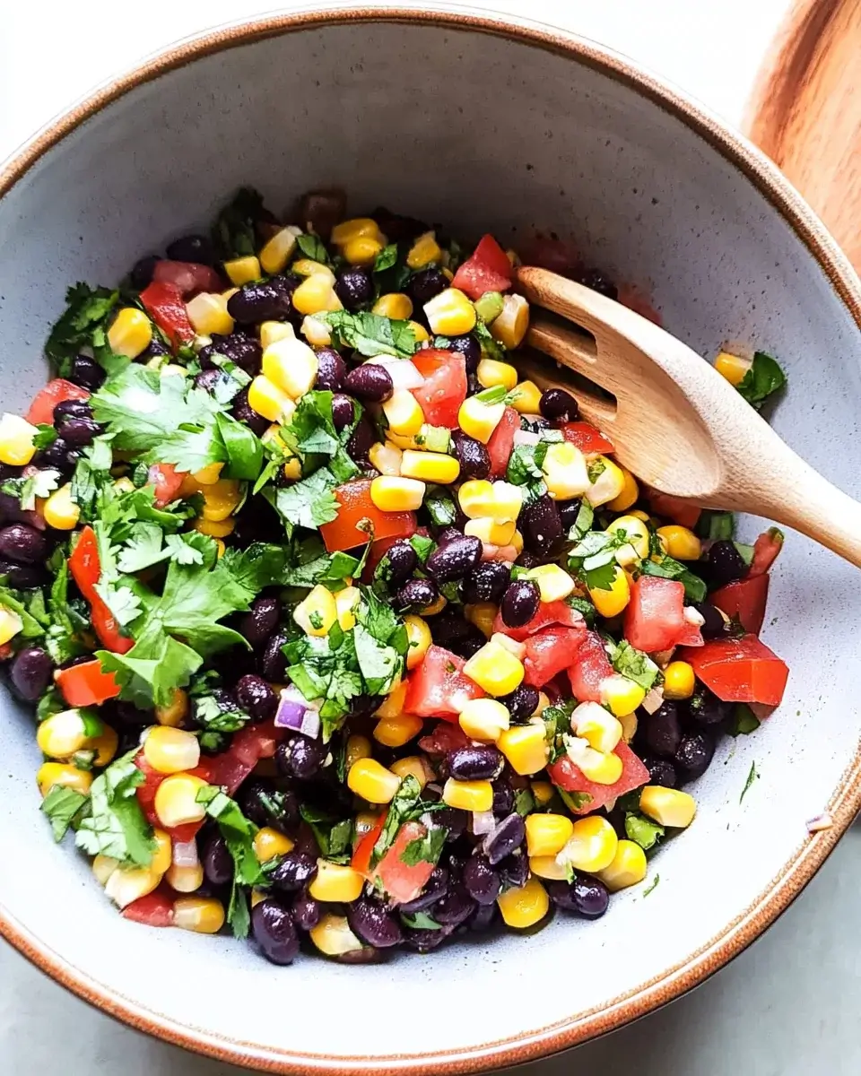 - In a large mixing bowl, combine the black beans, corn, red bell pepper, cucumber, red onion, and cilantro.